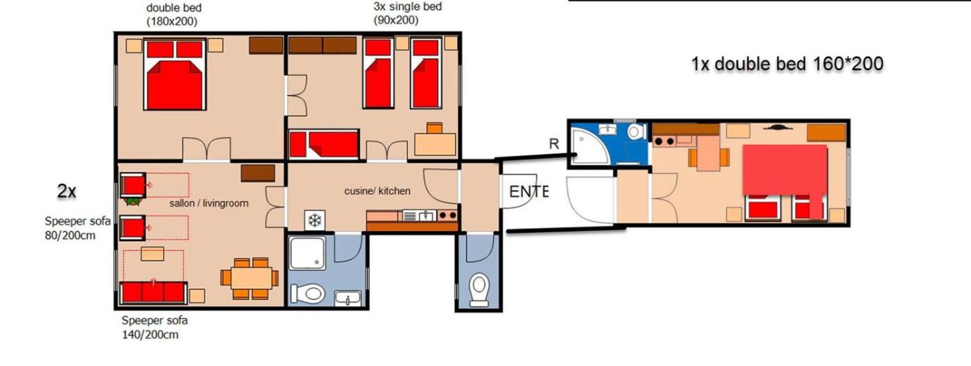 Three-Bedroom Apartment. This spacious apartment features a kitchen, a seating area, 3 separate bedrooms and 1 bathroom with a shower and a hairdryer. Guests can make meals in the kitchen that has a refrigerator, a dishwasher, an oven and a microwave. This apartment has a washing machine, a tea and coffee maker, a flat-screen TV and a balcony. The unit has 7 beds.